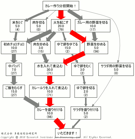 3つのタスクグラフの内、キャンプでカレーを作る手順のタスクグラフは本ホームページではもうおなじみのタスクグラフですが、残りの2つは初めて見るタスクグラフです。