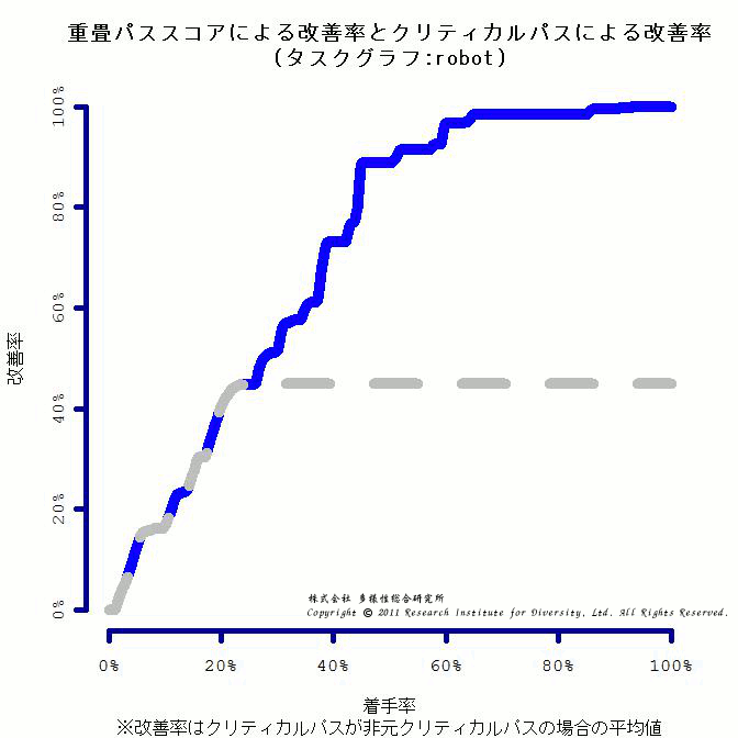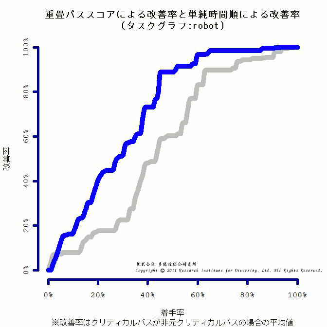 重畳パススコアによる改善率とクリティカルパスによる改善率のグラフを見てみましょう。クリティカルパスは前にも触れましたが着手率20%程度で改善率50%となり頭打ちとなってしまいます。しかし重畳パススコアは頭打ちとはならず、クリティカルパスのさらに上を目指すことができ、着手率100%では改善率を100%にすることが可能となります。