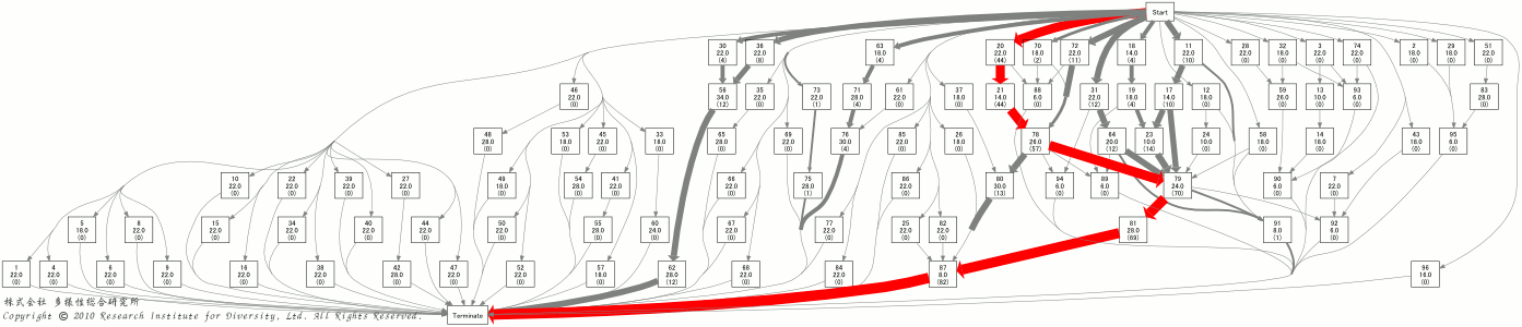タスクグラフ中、線の太さは変動したクリティカルパスの経路となった回数に依存し、赤い色の線は、本来のタスクの所要時間として指定されている時間で計算したクリティカルパスの経路を示しています。 また、タスク内の文字は上から順に、